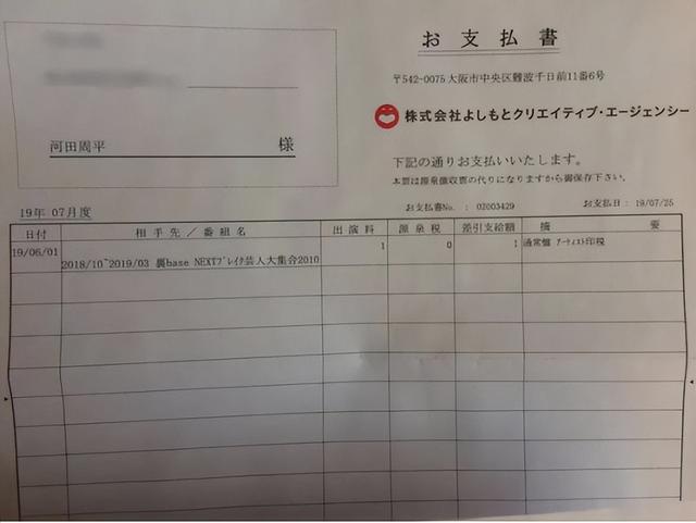 曾经一位日本搞笑艺人在网上晒出工资单,演出费只有1日元(约合人民币5分钱)。
