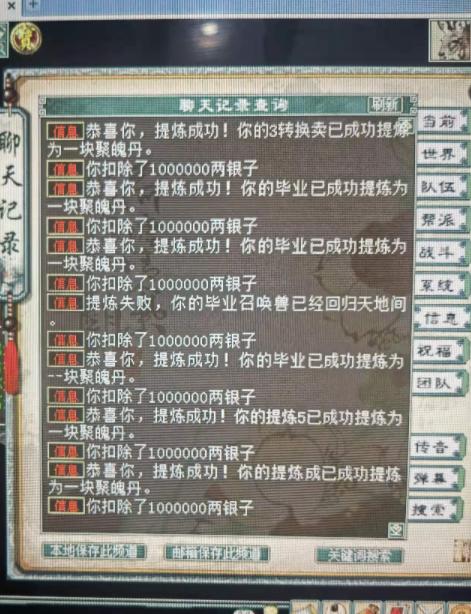 兄弟这是吃了几个菜,7个提炼成功6个,几率是不是有些过分的大了?提炼召唤兽的玩家是真心大,基本和挖宝的代价差不多,现在3转召唤兽也是越来越少了,基本手里都是点化。