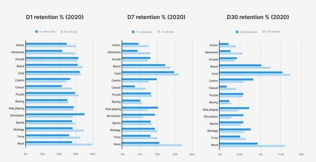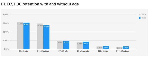 变现模式方面,广告对于游戏留存率的影响并不明显。报告显示,与2019年相比,不加入广告的次日、七日和30日留存,低于接入广告的留存表现。