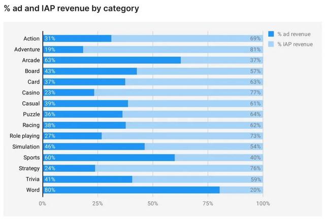 各游戏品类广告收入(蓝色)与内购收入(浅蓝)占比