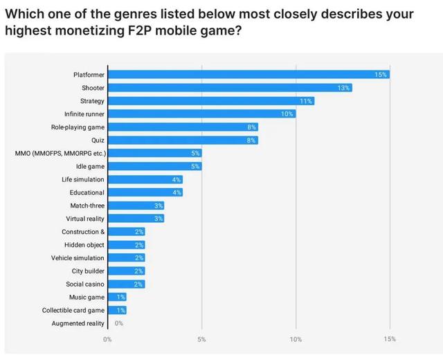 从游戏变现能力来看,通过平台游戏、射击、SLG、跑酷、RPG和解谜游戏获得高收入的开发者比例最高,而只有不超过5%的开发者凭借MMO、三消等品类获得收入。