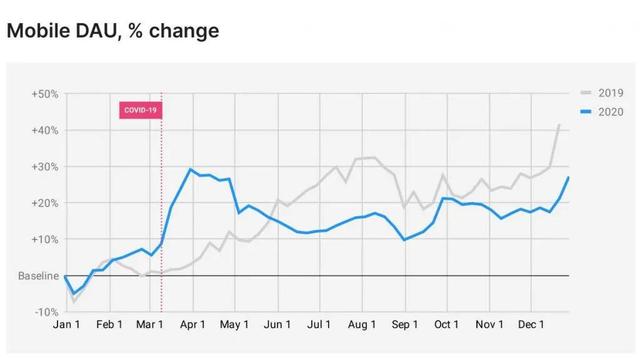 COVID-19对于人们玩游戏的方式有着重大的影响,手游日活跃用户在疫情爆发后出现了快速增长,但随着时间的推移,手游使用率开始回落,达到了与2019年持平的增长速度。