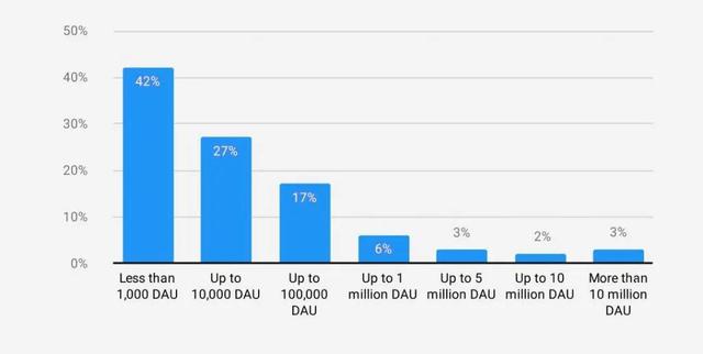 免费模式是手游市场最主流的模式,不过,这个市场的赢家却往往是头部产品。报告显示,只有8%的免费手游产品DAU超过100万,超过1000万DAU的免费手游只有3%,而DAU超过10万(低于100万)的产品只占6%。