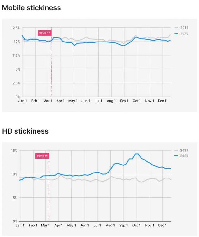 另一方面,高分辨率游戏在2020年展现了极高的用户粘性,这很可能有一部分原因是新主机的发布,但还有一个原因则是其他可选择的替代娱乐方式很少。高分辨率游戏的用户粘性平均提高了1.82%,虽然看起来不高,但Unity表示,考虑到大多数的游戏用户粘性都只有10%,这已经是很重大的增长。