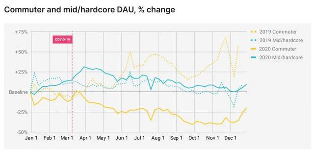 平均来说,2019年的时候,工作日玩游戏的比例比周末低了1.39%。到了2020年,这个差别只有0.91%。这意味着人们将52.7%的周末游戏时间分配到了工作日。中重度应用在疫情期间持续增长,因为人们发现有了更多时间获得深度体验。过去的一年里,玩家行为又回到了2019年的趋势。