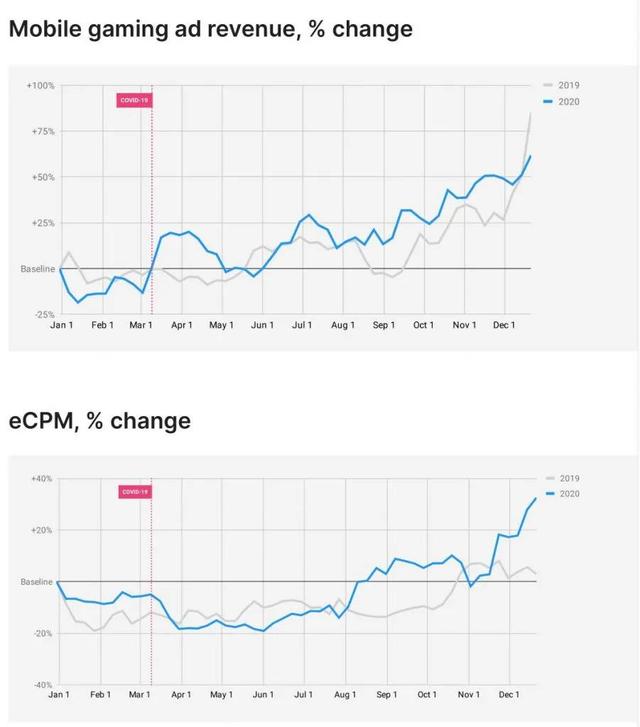 与此同时,电脑应用出现跳水,且再也没有回到2019年的增长趋势。当疫情公布、全球宣布社交隔离的时候,手游广告收入出现了下滑,不过,每次广告浏览带来的eCPM却出现了下滑。然而,随着时间的推移,eCPM价格稳定增长,到年底达到了非常高的水平。和2019年的增长趋势相比,2020年整体手游广告收入增长了8%,eCPM价格增长了5%。