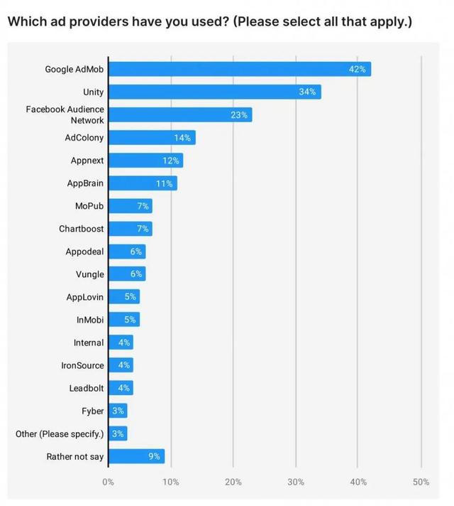从广告接入平台来看,覆盖率最高的五大广告网络分别是谷歌Admob、Unity、Facebook、AdColony和Appnext。