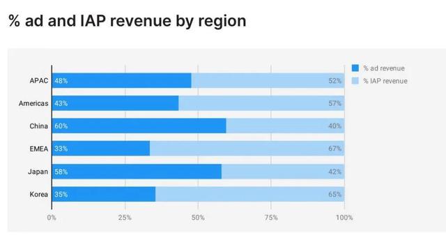在很多人的印象里,以休闲游戏为主的欧美市场,广告变现应该有非常重要的贡献,因此广告收入占美国游戏收入43%并不让人意外。但在中重度游戏流行的中国和日本市场,令人惊讶的是,游戏收入竟然半数以上都来自于广告变现。