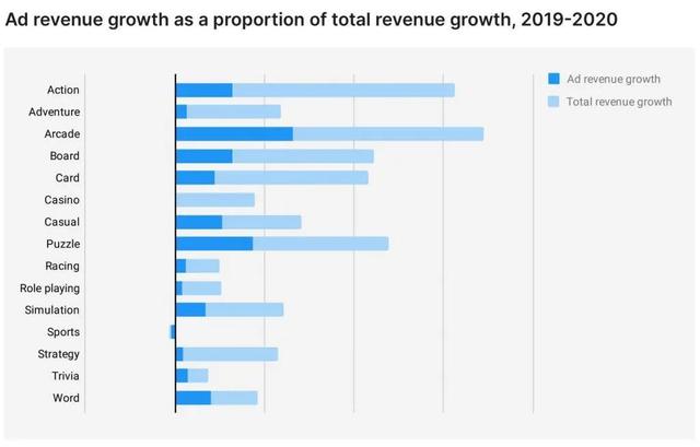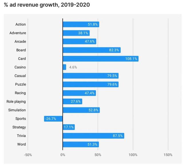 在2020年,动作游戏凭借51.9%的广告收入增长令人瞩目,卡牌游戏的广告收入增长率达到了108.1%,比2019年的表现更为强势。