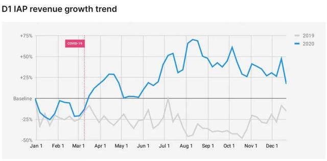 随着春季全球社交隔离的实施,手游首日内购增长到了峰值,但在暑期很快回落随后的半年里都保持稳定。通常来说,在11月假期季开始之前,游戏收入往往会低于1月1日的基线,但2020年为手游公司创下了新纪录。过去的一年里,首日内购消费比2019年增长超过了50%。