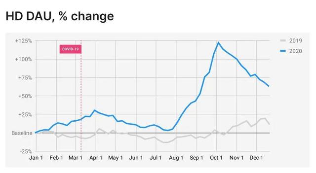 不过,高分辨率游戏(在PC、macOS和其他高分辨率渲染的桌面游戏平台)在2020年增长了38%,并且一直增长稳定,甚至还在秋季和冬季迎来了比较大的增长。