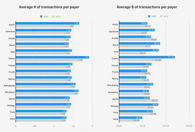 与2019年相比,2020年棋牌游戏的表现亮眼,该品类无论是平均内购次数还是用户每次消费金额都出现增长。尽管该品类每付费用户的平均付费增长了0.17%,但每次付费金额却增长了2.84美元,达到11.92美元。