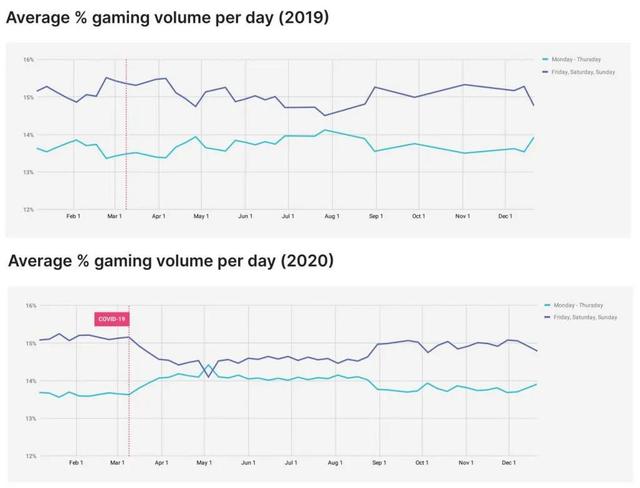 2020开年的时候,工作日和周末的游戏时间分布与2019年相似。然而,当封城隔离开始之后,工作日和周末游戏习惯之间的差异越来越小,尤其是暑期,它们甚至在5月份出现了交叉变化。