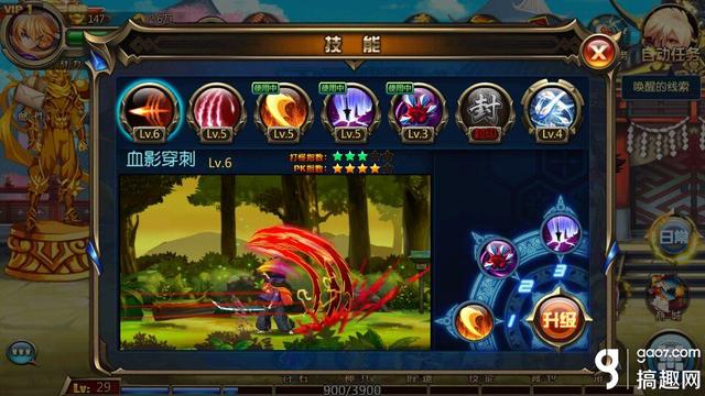 破妖斩:向前方发出一道强力月行刀波,不需要解锁,打怪指数3颗星,PK指数4颗星;冷却时间7秒,攻击次数3次,造成精神消耗22MP,角色达到一定级别后可以升级技能,伤害总量也会相应提升,也可以重置技能。