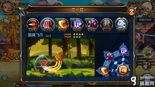 狼啸飞爪:向敌人发出多段攻击,不需要解锁,打怪指数4颗星,PK指数3颗星;冷却时间5秒,攻击次数8次,造成精神消耗18MP。