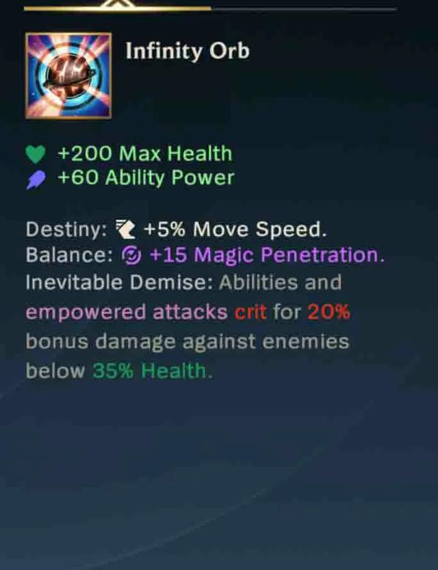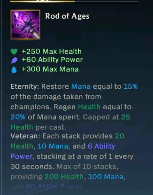 唯一被动:每层效果提供20生命值,10法力值,以及6法术强度,每30秒获得一层,最多10层,获得200生命值,100法力值和60法术强度
