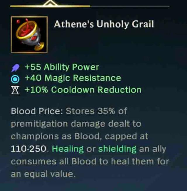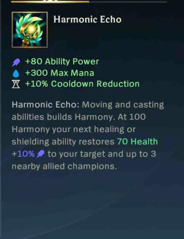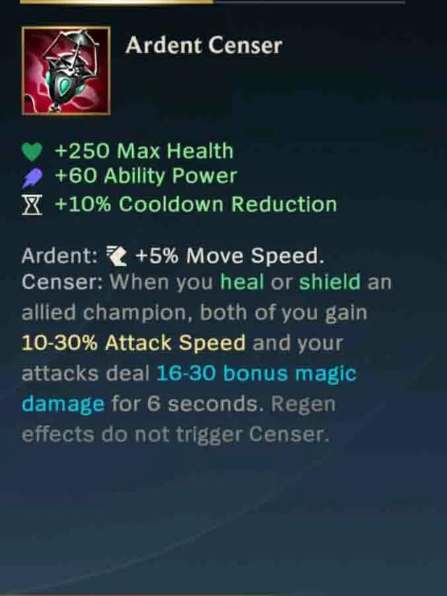 唯一被动—香炉:每当你对一名友方英雄施加治疗和护盾时,你和目标英雄都会获得10%-30%攻击速度并且你们的攻击会在命中时造成额外的5-20魔法伤害,持续6秒。这个加成不包括生命回复效果