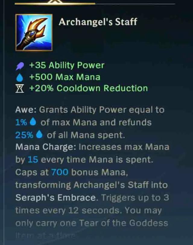 唯一被动—法力积攒:你的英雄每次花费法力时,你的最大法力值都会提高12,法力值加成上限为700。当法力值达到700后这个装备将升级为【炽天使之拥】