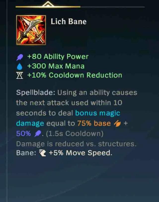 唯一被动—咒刃:施放一次技能后,10秒内的下一次物理攻击将附带75%基础攻击力(+50%法术强度)的额外魔法伤害——1.5秒CD(对建筑的伤害减少)