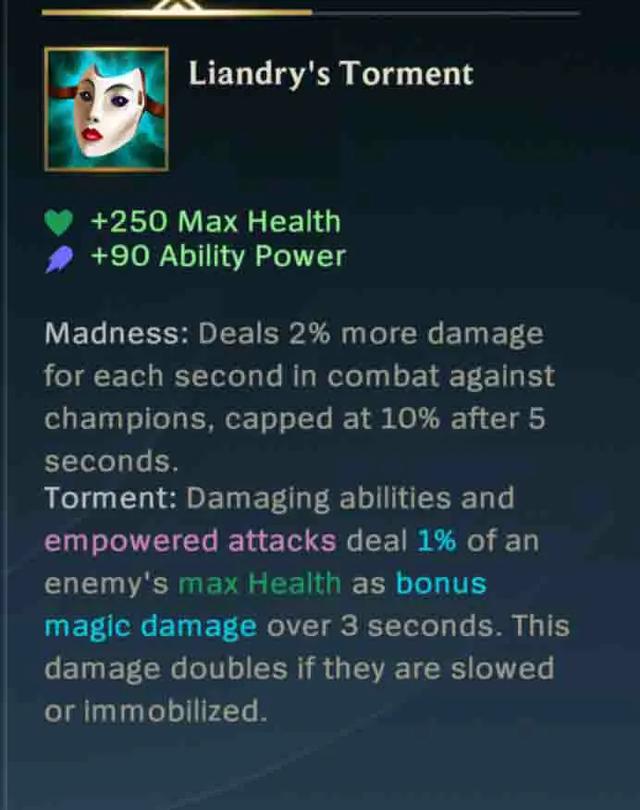 唯一被动—折磨:技能会灼烧目标3秒,每秒造成相当于目标1%最大生命值的魔法伤害。这个额外伤害会在对抗移动受损的单位时翻倍