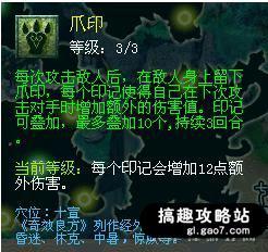 爪印:每次攻击敌人后,在敌人身上会留下一个爪印,每个印记会使自己在下次攻击对手时增加(4/8/12)点额外伤害,爪印最多叠加10个,持续3回合。