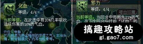 两个技能的关系是化血为邪力的前置技能。化血:在攻击时有20%的几率吸收造成伤害的(4%/8%/12%/16%)的气血。邪力:当回合中每损失(30%/27%/24%/21%)的气血,在下个回合中技能“化血”的触发几率提升3%。在两个技能都满层的情况下,如果嗜血魔神路线的狮驼失去自身气血的21%后,在攻击敌方目标的时候有23%的几率吸取攻击目标失血量的的16%。