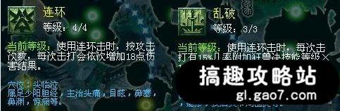 两个技能的关系是连环为乱破的前置技能。连环:使用连环击时,按攻击次数,每次击打会依次增加(9/12/15/18)点伤害。乱破:使用连环击时,每次击打有15%几率附加狂兽决技能等级*(50%/75%/100%)的伤害。我只按等级最大化为大家来解释一下这两个兄弟技能叠加的可怕,满技能狂兽决为180,如果我们假设一个极品狮驼岭175级的伤害为2700那么暂时先不算他连环每下所递减的伤害,那么他的连环击6下有可能造成的伤害为2700+18+180,2700+36+180,2700+54+180,2700+72+180,2700+90+180,2700+108+180。由于递减的连续伤害比递增的连续伤害更容易触发自动保护,那么使用天赋加强后的连环击进行点杀目标,友情保护的威胁会有一定减少。