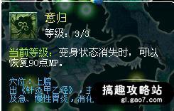 意归,变身状态消失时,可以回复(30/60/90)点MP。如果是双封携带狮驼岭的队伍,或者自认为可以将战斗节奏控制的有条不紊的队伍请自动忽略这个技能;而针对PK节奏控制很快的队伍,例如3暴力以上携带狮驼岭的队伍,此技能无疑雪中送炭。可以解决现在战斗中节奏过快,没有快速宝宝为被破碎过的狮驼加蓝的问题,从而避免了空蓝狮驼岭因为无宝宝衔接导致无法变身延误战局的情况。