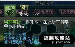 此技能十分诡异,可能今后会有相应的修改,此技能在存在于四象的穴位上但是学习要求是六合的要求需要消耗36点乾元丹方可使用,笔者暂时将其调整到6层。技能效果说明:提升本方在场所有召唤兽(2%/4%)的防御力。笔者在这里说一些题外话,一般这次奇经八脉出的经脉技能凡是针对本方所有单位或者所有召唤兽的,一般都是神技而且很少例外。那么我们下面来看看这个技能,提升本方在场所有召唤兽4%的防御,等于无形中为队内40只宝宝加了一个小圣灵,其作用不言而喻。