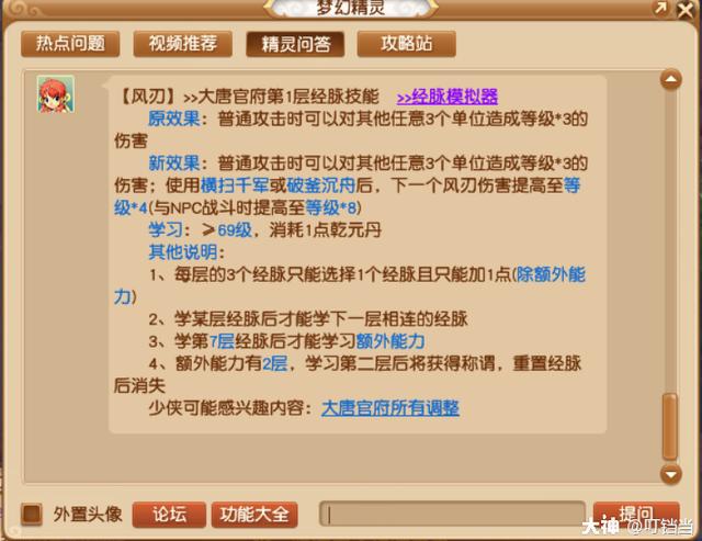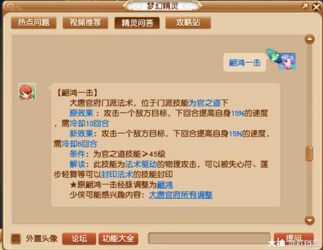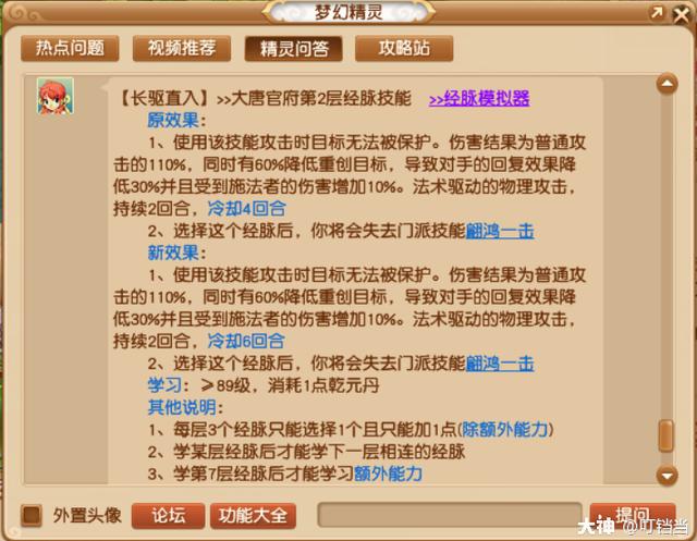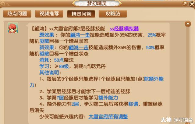 ✨新效果从原先的技能冷却10回合变为6回合,对于技能少的大唐来说不失为一件好事,配合奇经八脉第二丹左一位置的翩鸿在非普通战斗模式中也是不错的选择!