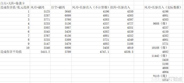 上图是渣渣当队里的DT在木桩测试的数据(风刃+翩鸿和目空+翩鸿时的翩鸿一击数据&风刃+长驱直入和扶阵+长驱直入时的长驱直入数据),装备+白天+天阵+偷袭卡不变的条件下选择不同的乾元组合造成的伤害记录。可以看到翩鸿的数据相对稳定,在第一丹选目空的情况下,伤害稍稍提升,当然对方防御越低,我方伤害越高,数值差会越大!让渣渣当意想不到的是居然风刃+长驱直入的数据要比扶阵+长驱直入的高这3%的加成这么薄弱么,我只能猜想可能是测试数据不够多的原因,另外实际风刃+长驱直入组的数据爆了好几次,而扶阵+长驱直入组一次没爆,不知道是巧合还是风刃+长驱直入更搭