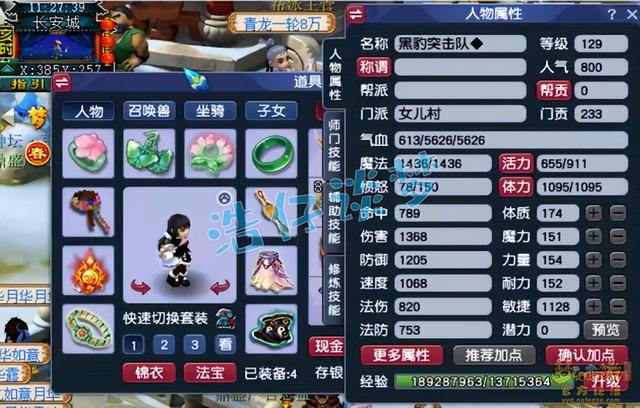 100级画魂套女衣,体敏双加43,打了10锻月亮石。固伤门派的武器和铠甲位置也比较关键,因为敏捷影响固伤,所以大多还是选择高敏属性。