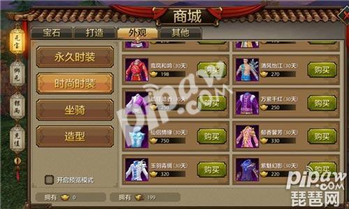 3.外观类:各种时装,坐骑,造型的道具。时装分30天永久两种。坐骑一般都是30天的。宋辽战场的坐骑是永久的,充值礼包中送的翅膀也是永久的。