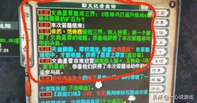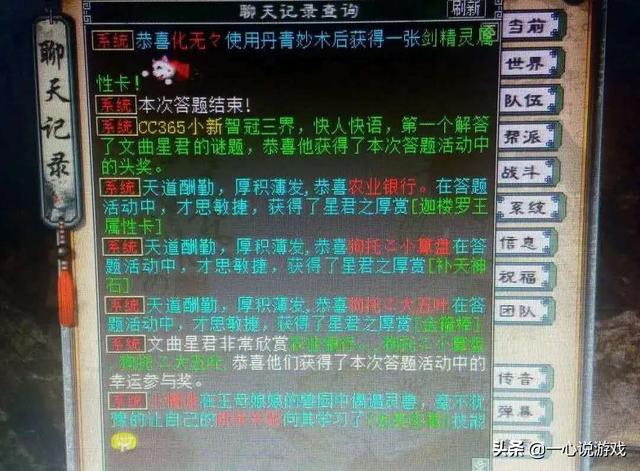 三界答题大家都抢过头条吧,一心记得有一次抢到了头条结果给了一个分身娃娃,第二给了个补天,看一下这位CC365小新的兄弟,头条是抢到了,只可惜,榜二榜三榜四都拿到了幸运奖,榜一傻眼了。