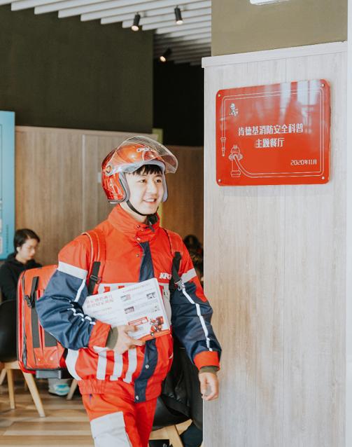 在安徽肯德基消防主题餐厅,红骑士还化身消防宣传员,为外送到家的消费者送去消防科普科普单页,提醒大家注意居家防火知识,落实消防责任,防范安全风险。