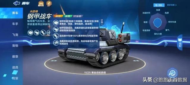 钢甲战车是2021年11月25日S15赛季通过黄金齿轮获得的一辆传说道具车。是一辆辅助车,百分百防御8个道具以及高概率防御导弹是游戏迄今为止防御道具最多的一辆赛车。尤其是一技能直接使好几辆赛车的核心攻击道具在钢甲战车面前不但完全失效,还能高概率变成特殊导弹。不过组队道具赛中除了普通路障及普通香蕉皮,很少会有其余地面垃圾,而防御之后获得的特殊导弹有一定的随机性,队友领跑时复位踩皮很可能获得超级导弹从而空放影响后追的节奏。虽然钢甲战车没有后追上位的技能,电磁导弹燃烧弹以及超级导弹威力对对手的威胁并不是十分巨大,但是在法老、工程车、电音巨猩、法老横行的个人道具赛中钢甲战车还是能发挥不小的作用,不过需要小心黄金水炸弹及猩猩氮气产生的音爆以及偶尔出现的飞镖小蜜蜂毒性水苍蝇等特殊道具,可以选择同时防御水苍蝇或水炸弹的宠物和徽章。
