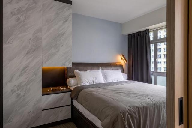 卧室的空间比较小,从衣柜当中镂空做床头柜的设计,可以节省卧室的空间,在床头柜里面内嵌灯带,在拿取物品的时候不会有光照死角。