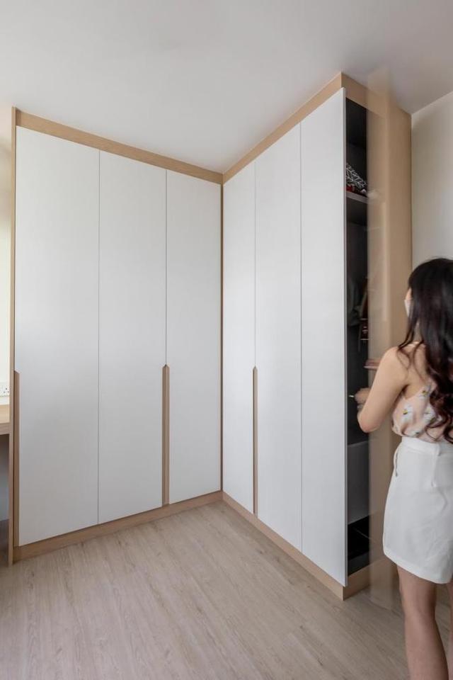 一门到顶的衣柜增加衣服的收纳空间,无把手的设计让柜子的整体性统一,在柜子的侧面空间做隐形收纳设计,里面装上隔板可以用来收纳一些包包。