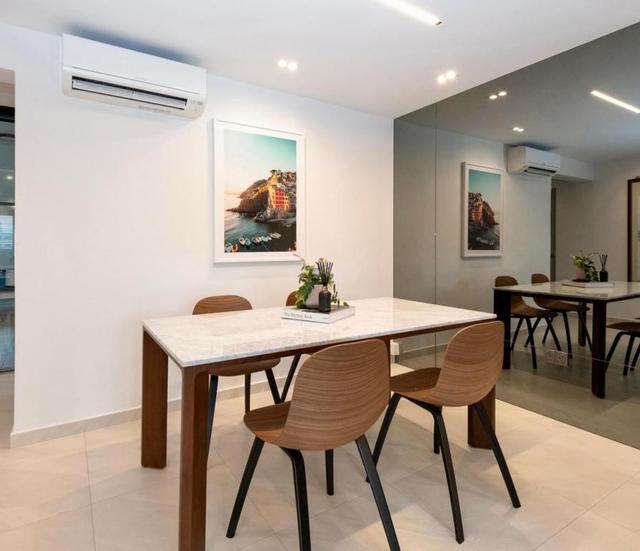 餐厅设置在转角区域,空间比较小,在墙面上装上玻璃装饰,为了划分区域,在地板的铺设上面选择容易清洁的地砖。