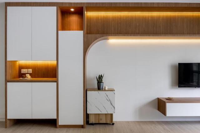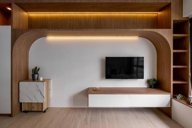 电视柜做到顶部的设计,上面的空间做镂空的设计,在里面内嵌灯带,做开放格设计,电视柜整体为弧形设计,在电视机下面做一字型的悬空电视柜收纳。
