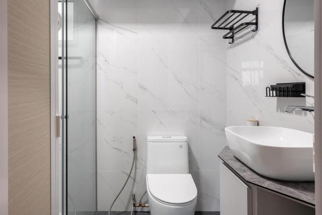 卫生间做L型设计,将淋浴区设置在转角处,中间装上玻璃门进行隔断,入门处装浴室柜设计,不规则的形状节省空间。
