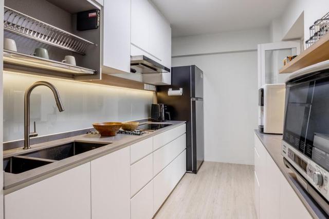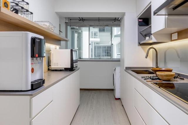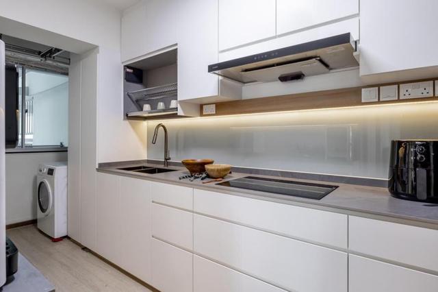 厨房一侧装半柜上面的台面空间可以当做操作台来使用,台面上方装墙面隔板的设计,用来收纳一些调料和干货,家电并没有采用内嵌式的设计,整个空间会显得一些乱,厨房阳台装上电动晾衣架,作为独立式洗衣房来使用。