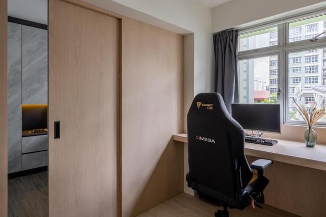 游戏房和卧室是连在一起的,两个空间装移门进行隔断,在靠窗的位置装上悬空书桌,同时还可以当做梳妆台来使用。