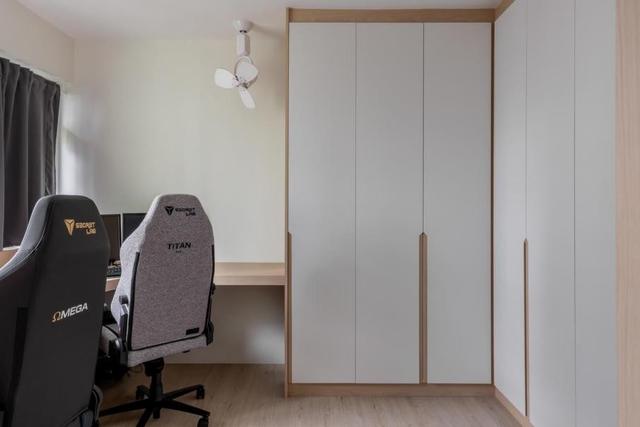 桌子转角处装L型衣柜,一个空间同时兼具两种功能,当做游戏房和衣帽间来使用。
