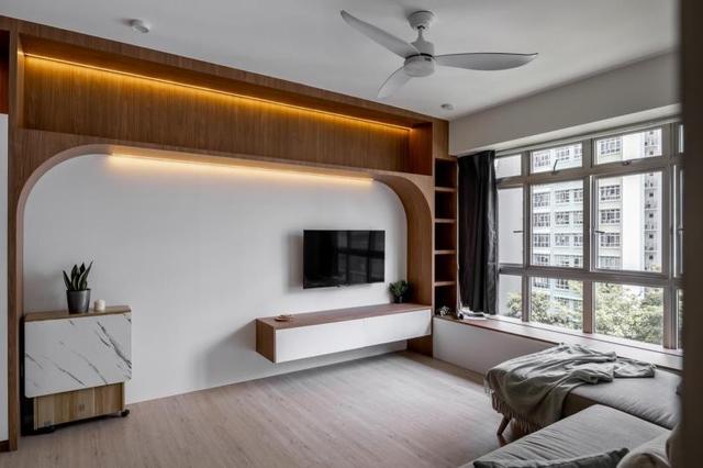 整面墙的电视柜设计延伸到飘窗上面,在飘窗的侧面做开放格设计,可以当做展示格来使用,飘窗空间作为休闲区。