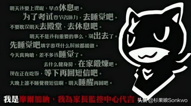 “那么,今天就先睡觉吧”这句话出自Atlus于2016年发售的JRPG《女神异闻录5》(Persona 5/P5)。游戏中的黑猫”摩尔加纳”跟主人公达成协议,会跟随主人公一起行动并借宿于他家。有趣的是,游戏中我们可以自由行动的时间只有4月9日至12月25日总计260天,但其中有99天的晚上摩尔加纳会强制玩家睡觉休息,“你已经很累了,今天就先睡觉吧”“明天就要潜入了,今天好好休息”“现在是做这种事的时候吗,今天就先睡觉吧”等等名句,让人不禁感叹有一种累,叫你家猫觉得你累,或许也只有猫猫会担心我们的睡眠了吧。