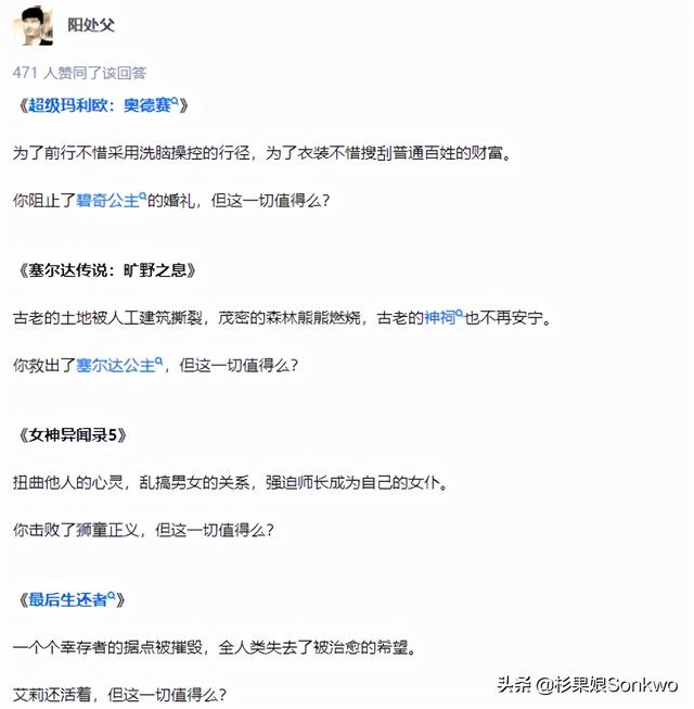 显然,网友们的智慧也没有让这个梗局限于游戏,随着传播不断发酵,哪怕是对道德审判反感的玩家也从中感知到了戏谑的意味。后来在很多作品中我们都能看到“可是这一切真的值得吗? ”飘过,这种或恰如其分或不合时宜的反思与追问十分有趣,衍生出的讽刺政治正确意味也让人忍俊不禁。