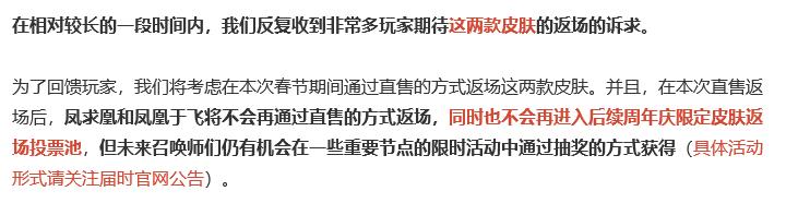 官方表示因为众多玩家都希望凤求凰以及凤凰于飞这两款皮肤返场,于是在凤求凰优化完成之际,官方将在此次春节期间进行直售返场,此次的返场也将是最后一次直售,后续想要获得只有等到抽奖。但王者的皮肤掉率大家都懂的,对于大部分玩家来说,错过此次凤求凰将会变成真正的绝版皮肤,大家千万不要错过哦!