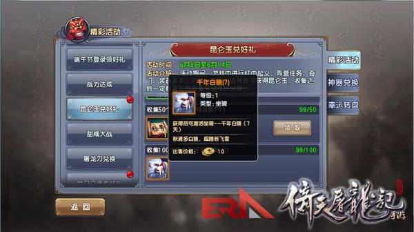 此外,玩家可以在每日活跃度奖励、幸运转盘等活动中获取屠龙令,收集屠龙令即可在活动界面兑换神器—屠龙刀!屠龙令亦可兑换新版独家独角兽坐骑白泽、稀有称号等奖励!另外,粽子节活动上线的同时,《倚天屠龙记》手游还做了一系列的优化更新,优化帮派福利、帮派战玩法的同时,还增加了全新的阵营成就和称号,相信这些与人同乐的做法会让游戏变得更加有趣啦!