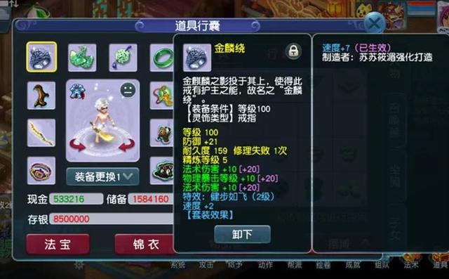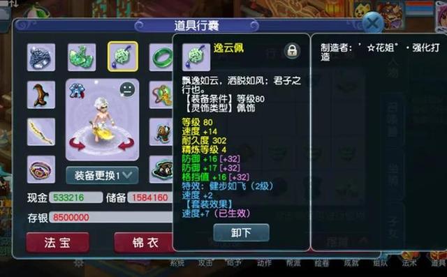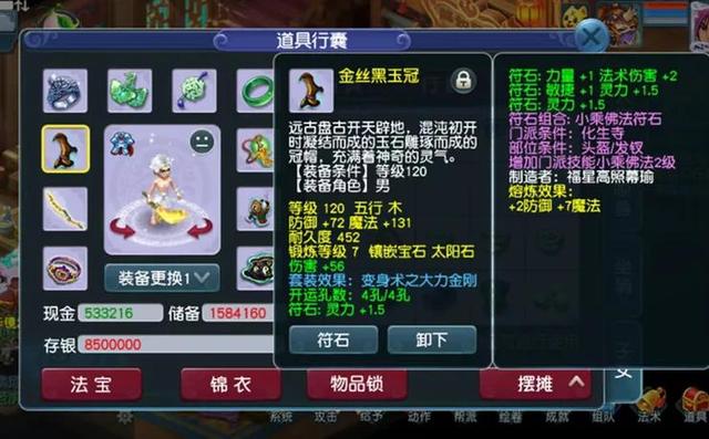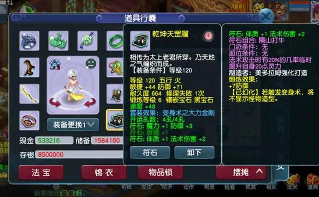 先来简单说一下角色底子,潜能果还差9个,吃满潜能果在无符情况下可以达到1760的法伤。目前神速才20级,健步如飞也才2级套,因为计算了一下发现,即使花点钱达到4级健步,把神速点满,速度也才450这样,一样不够速度。所以还是要打符,索性就摆烂,每天打一下速度符。下面展示一下配置的装备。